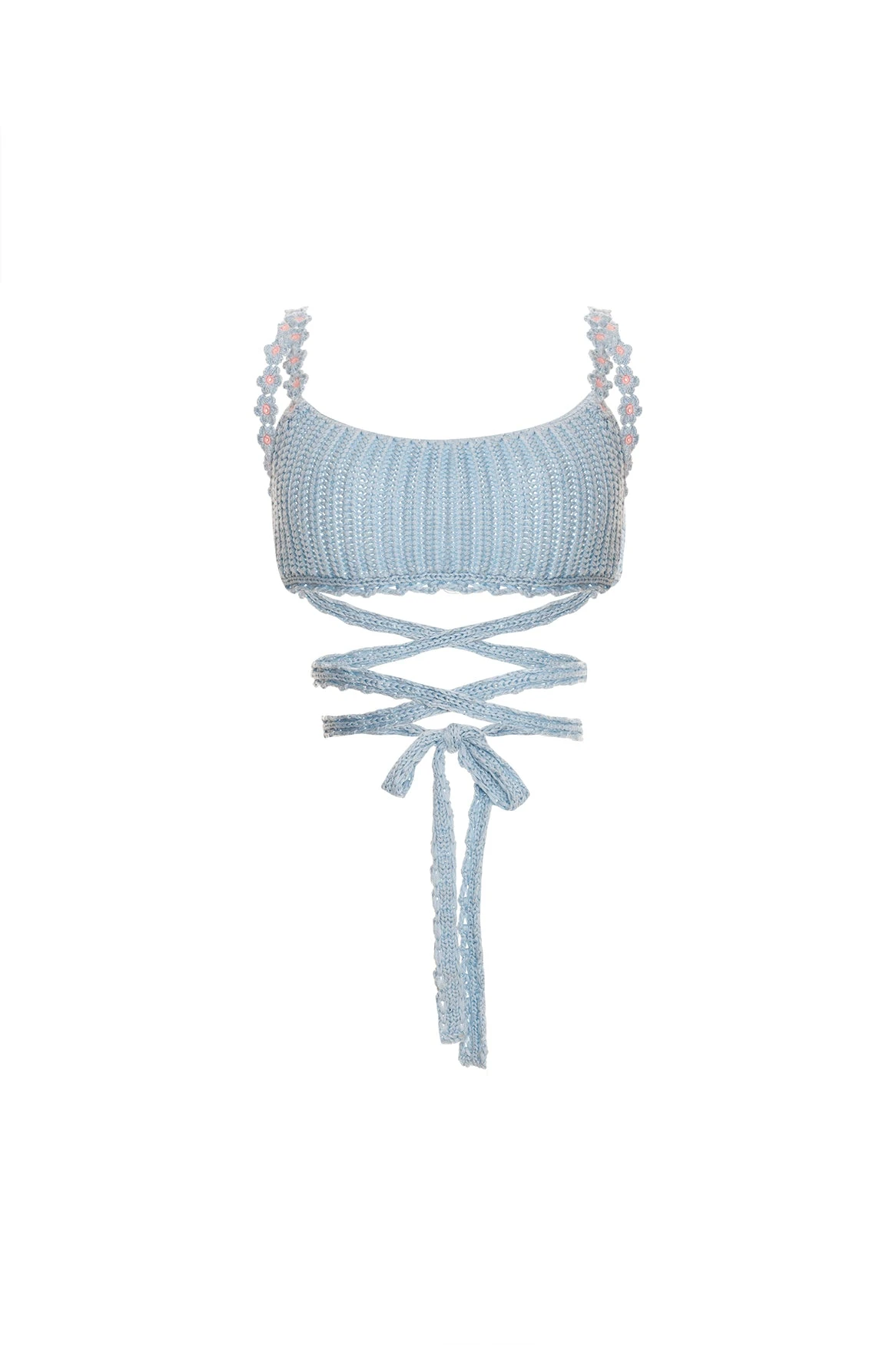 This knit crop top is studded with flowers on the straps and has adjustable soft tie waist straps to give a perfect fit. It’s a fun and flirty piece that’s perfect for the beach or a night out and can be paired with high-waisted shorts or a skirt for a complete look.
