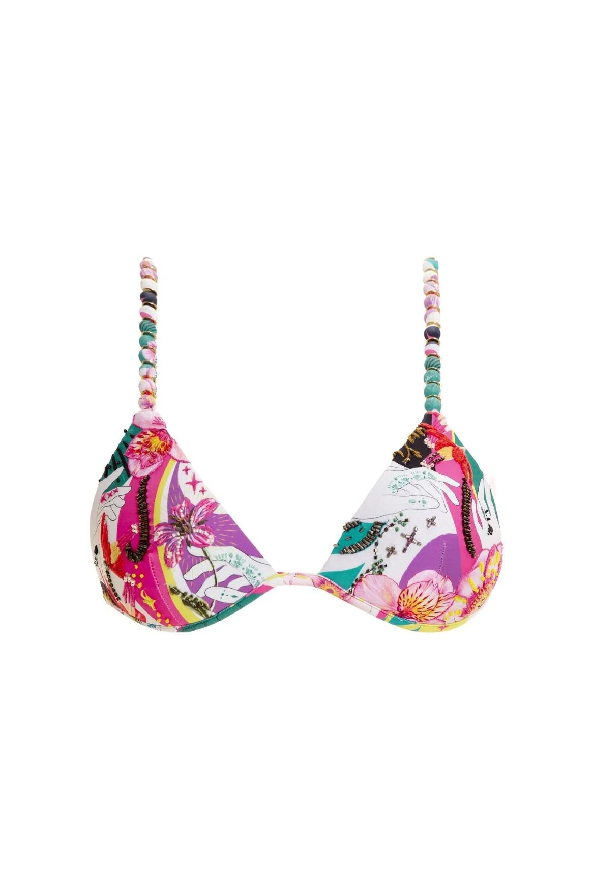 Experience the allure of our best-selling classic adjustable triangle slider top, the Belle Bikini Top. It boasts unique ring detailing on the straps and is adorned with handcrafted beading and embroidery on the cosmic, magical print, creating an exclusive and enchanting look. Plus, it comes with removable cups for added convenience.