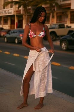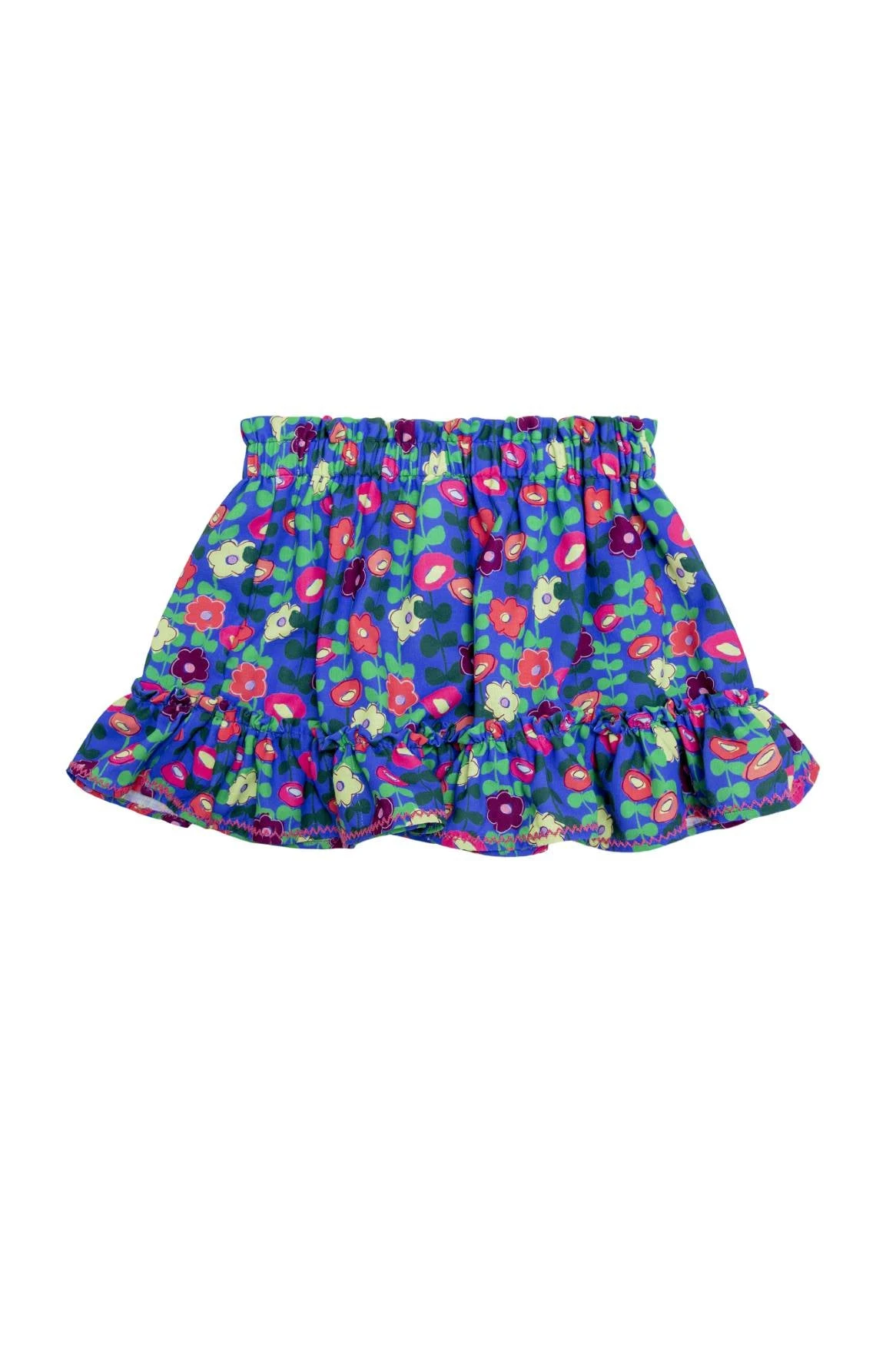 Ruffle skirt decorated with mini flowers for a charming handcrafted look. The ruched waist adds adjustability, ensuring a perfect fit for your growing child. Whether strolling on the beach or enjoying a day at the pool, this delightful skirt promises comfort and style in one playful package.