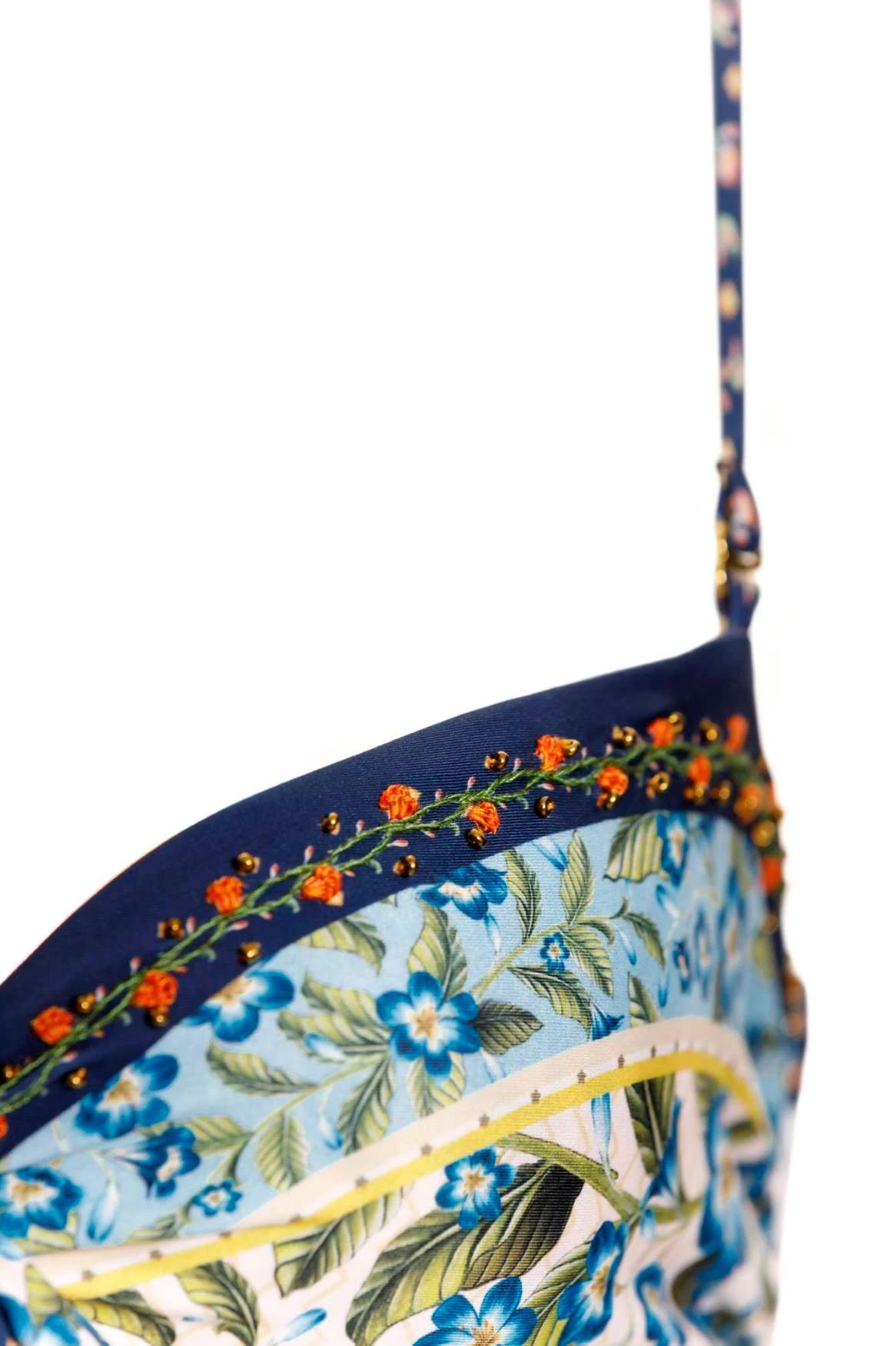 The Carrie One Piece Swimsuit is a cutout bandeau design with adjustable soft ties down the front. The exclusive print is accented with a border trim and handcrafted details for a unique and playful look.