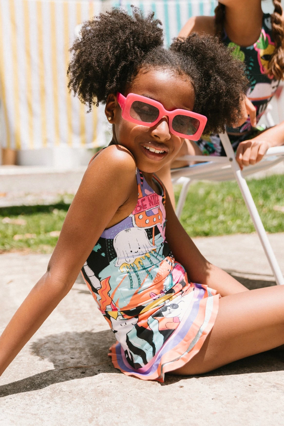The Debby Swimsuit is the perfect one-piece for girls with a colorful print, UV protection, and a waist wrap detail. Kids will love the style, and you will love the comfort and safety of this unique swimsuit.