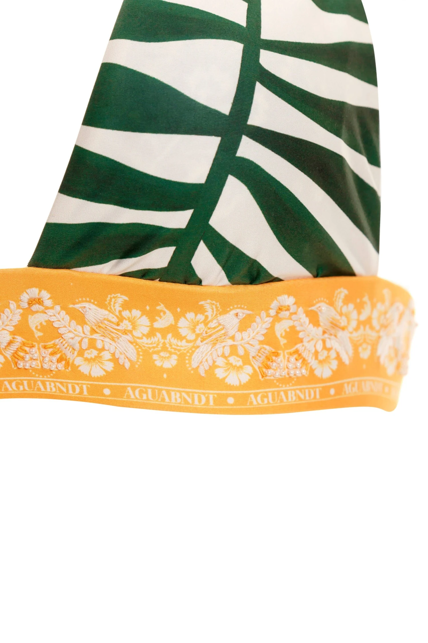 The Laurie Bikini Top has a halter style and is embroidered by our #ABhearts over our nature-inspired print that adds to the handmade look. The Laure Top is available in plus sizes and features adjustable straps at the shoulders for the perfect fit & support, and it’s made with recycled polyester. This top was embroidered for 9 hours by Sandra Grandos’ team of artisans, creating a complete piece of art.