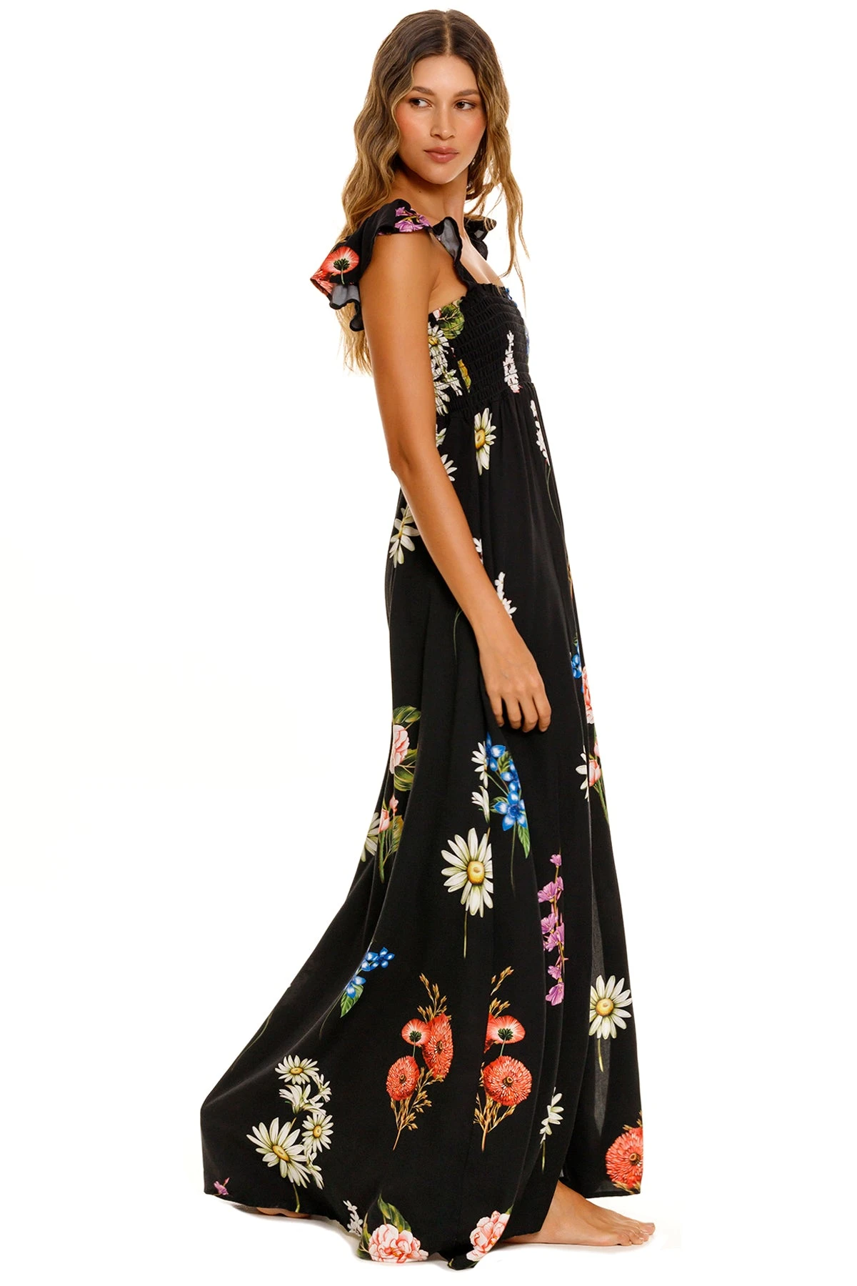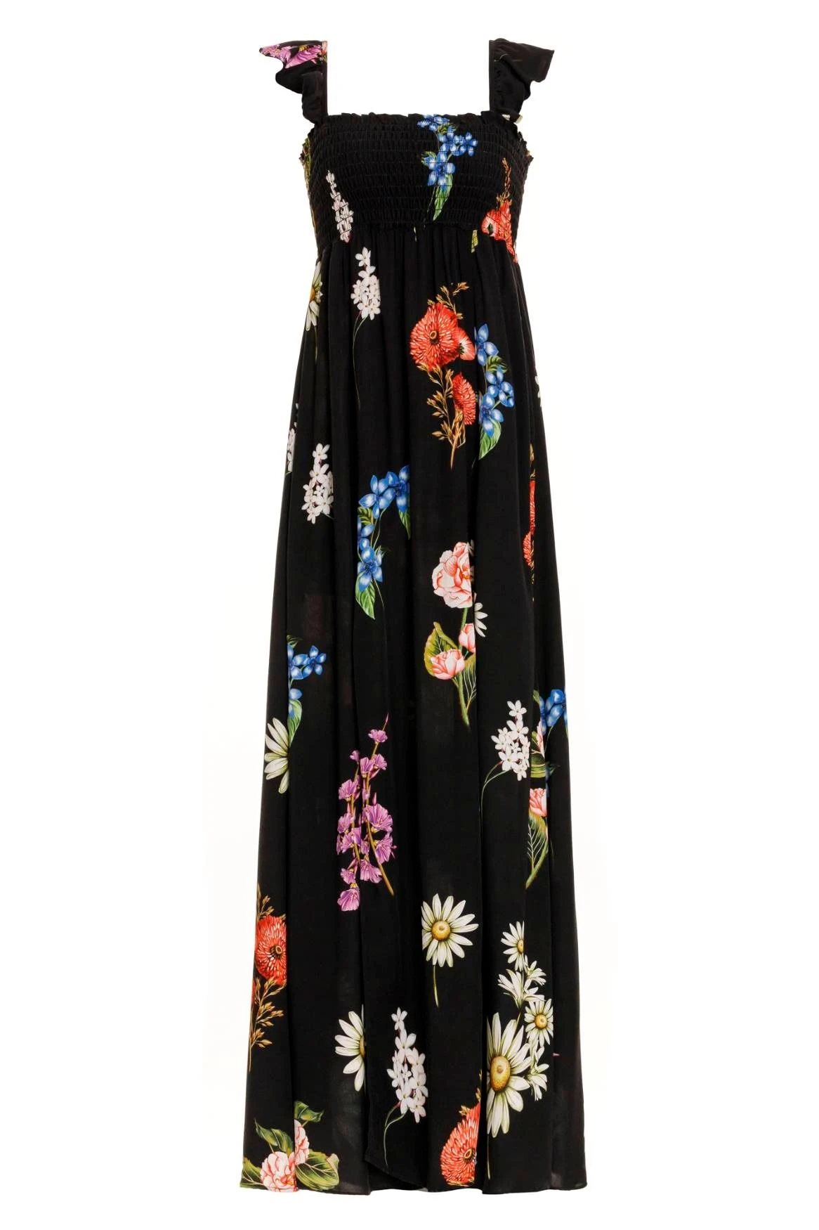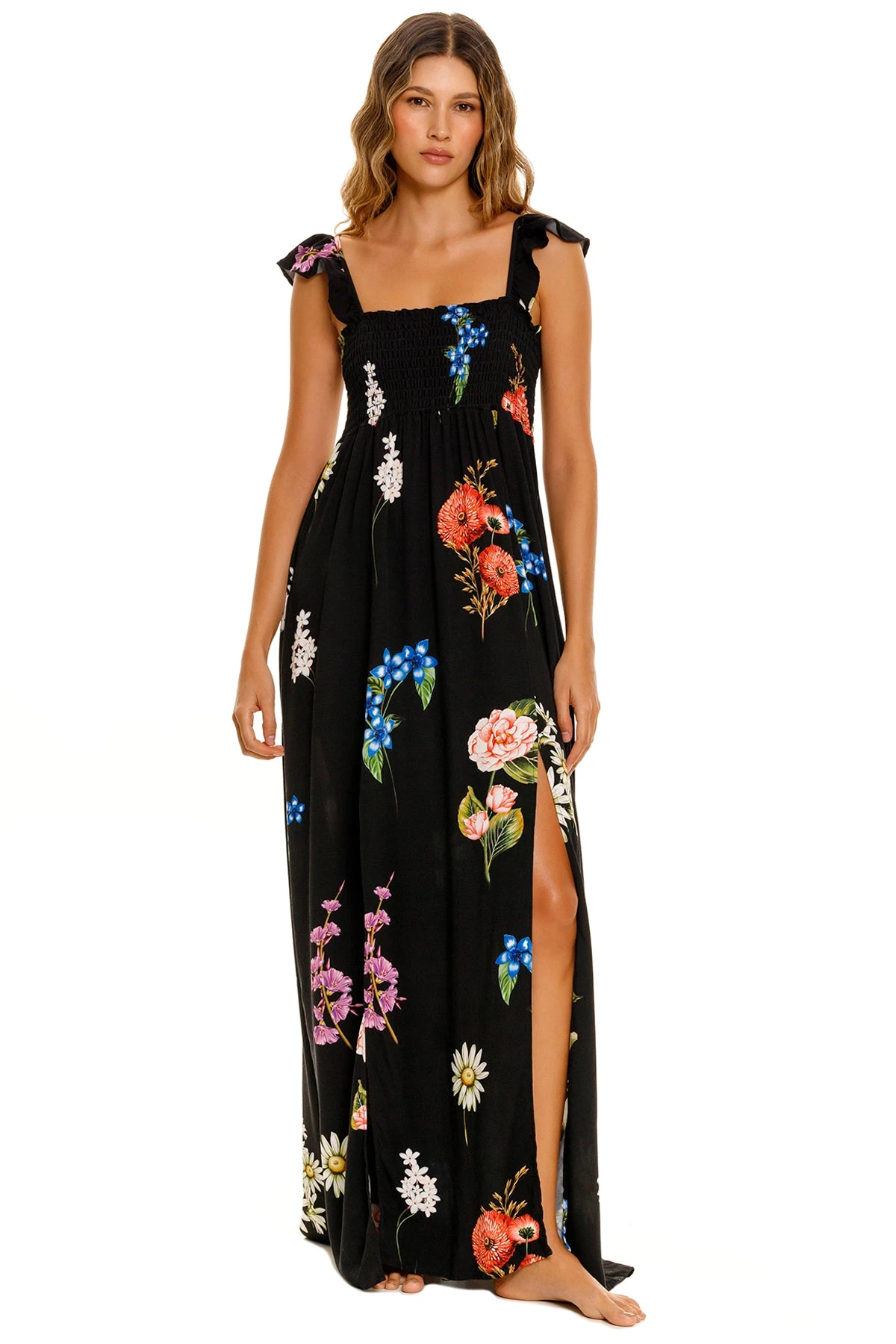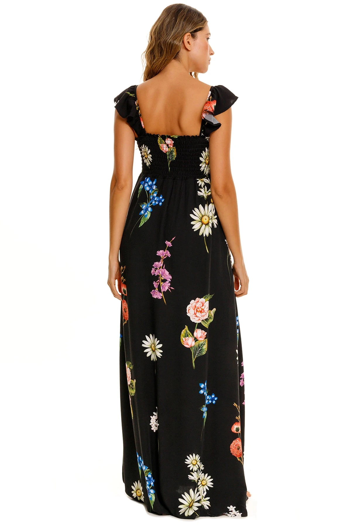 The ruched details on the front and back of our Leandra dress ensure a perfect and comfortable fit. Its delicate ruffled sleeves and side slit are the extra touches to stand out on any occasion.
