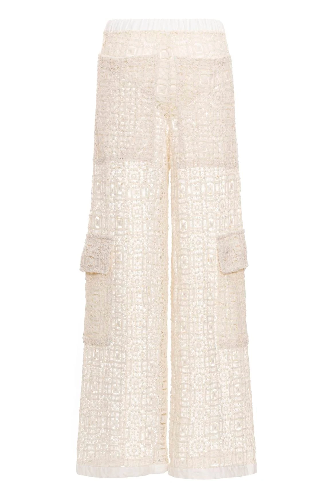 These pants are designed with a comfortable elastic waist and feature functional cargo and back pockets, which are ideal for your on-the-go essentials. The sheer fabric and open crochet weave offer a peek into the artfully considered details, making these pants a staple for those who love to combine utility with a touch of the ethereal. Each pair has a thoughtful undergarment to ensure you can confidently wear them. Whether dressing up for a casual outing or layering for a beach day, the Maca Cargo Pants are your go-to for effortless style.