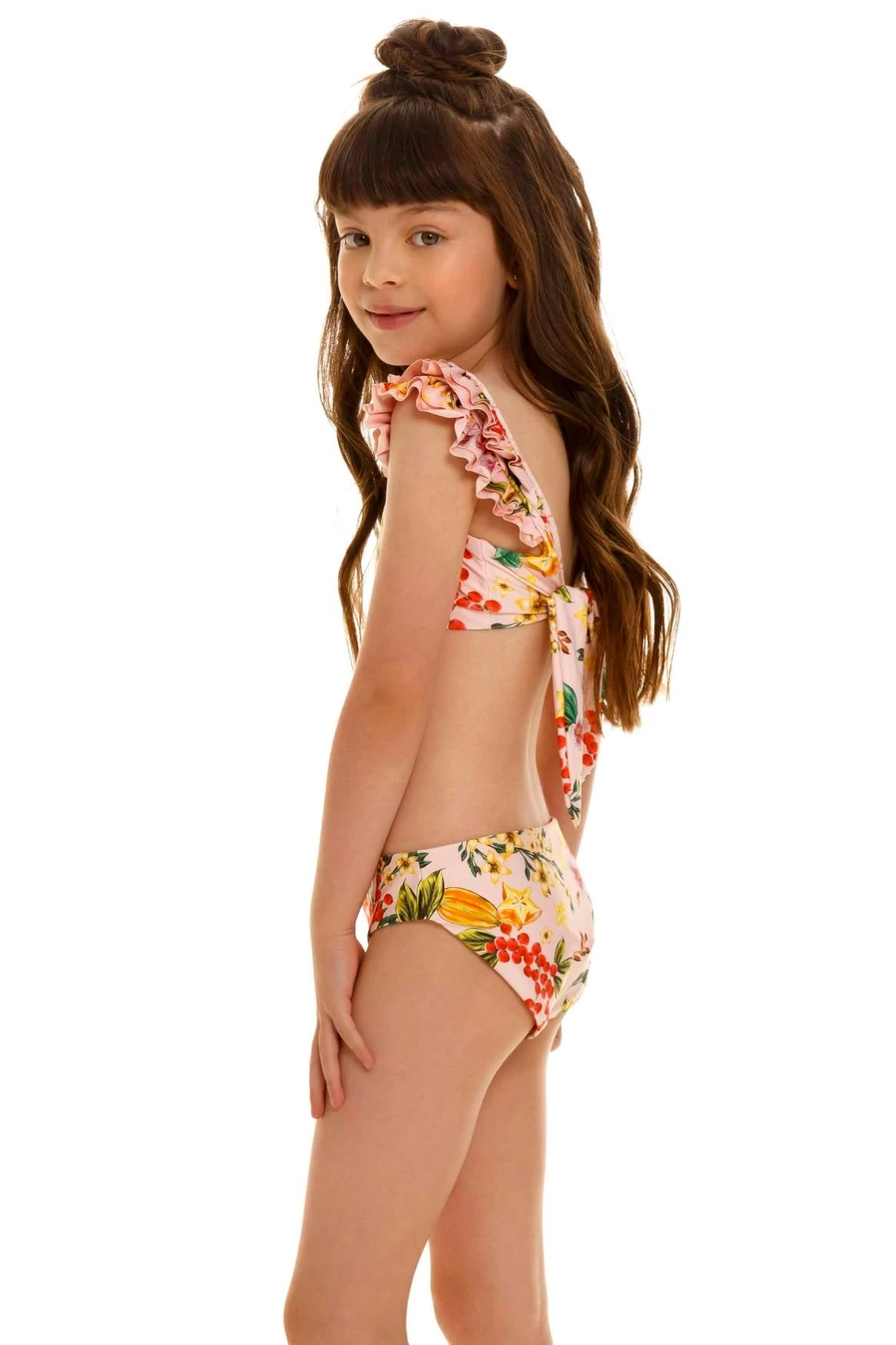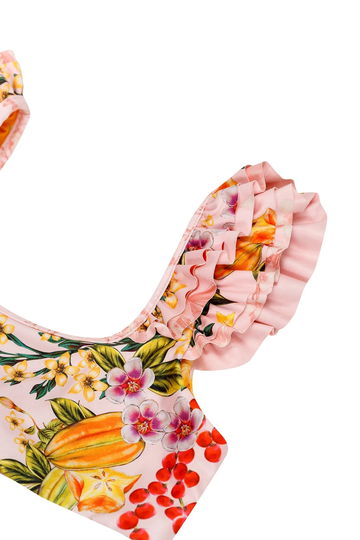 This bikini top is trimmed with rows of ruffles at the straps for a sweet and unique look. The back has a soft tie for adjustability, paired with clean, simple pants to finish the look. Perfect to have fun under the sun!