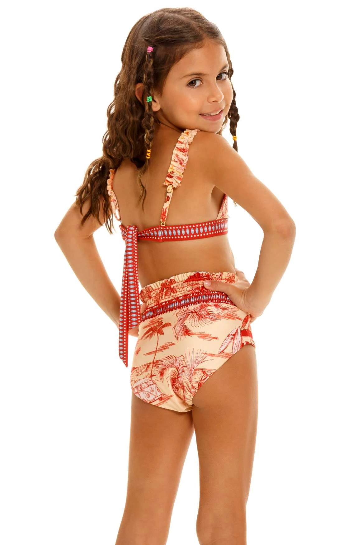 Make a statement in our eye-catching bikini top, featuring a ruffle neckline and ruffle straps for a feminine touch. The high waist bottom has a smocked waistband to ensure a comfortable and secure fit. Both pieces are accented with a colorful border that adds a handcrafted look to your beach outfit.