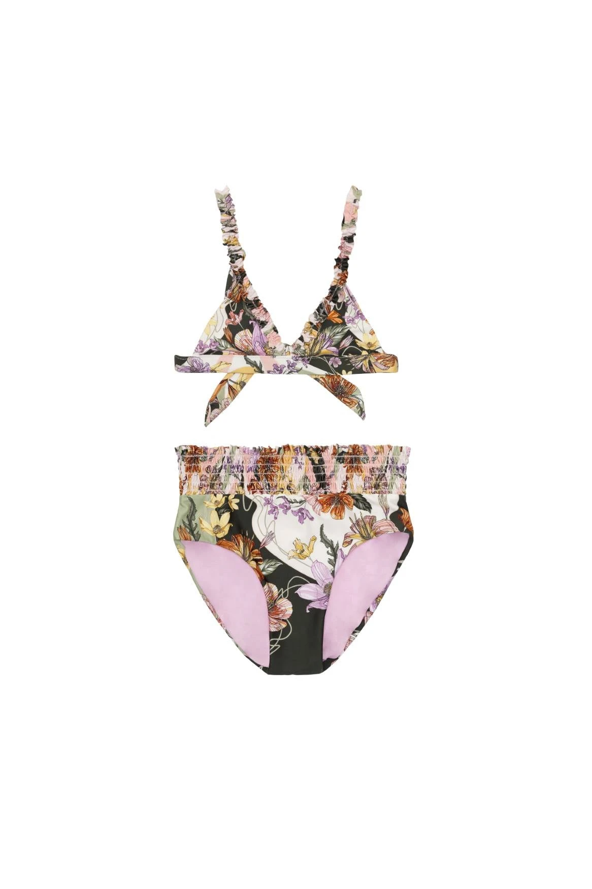 Make a statement in our eye-catching bikini top, featuring a ruffle neckline and ruffle straps for a feminine touch. The high waist bottom has a smocked waistband to ensure a comfortable and secure fit. Both pieces are accented with a colorful border that adds a handcrafted look to your beach outfit.